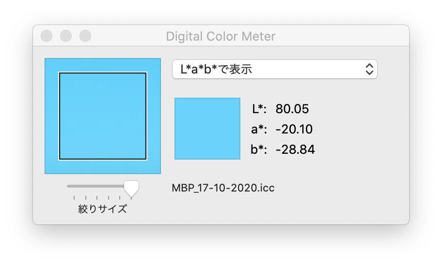 もちろんこの測色系を使うためには、L*a*b*の数値を知る必要がある.測色器はかなりお高いのだが、Macのディスプレイに表示されている画像なら、”Digital Color Meter”で数値を得ることができる.
