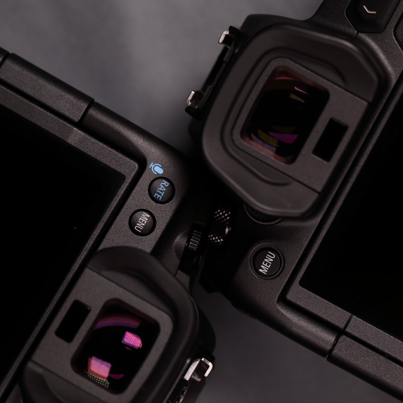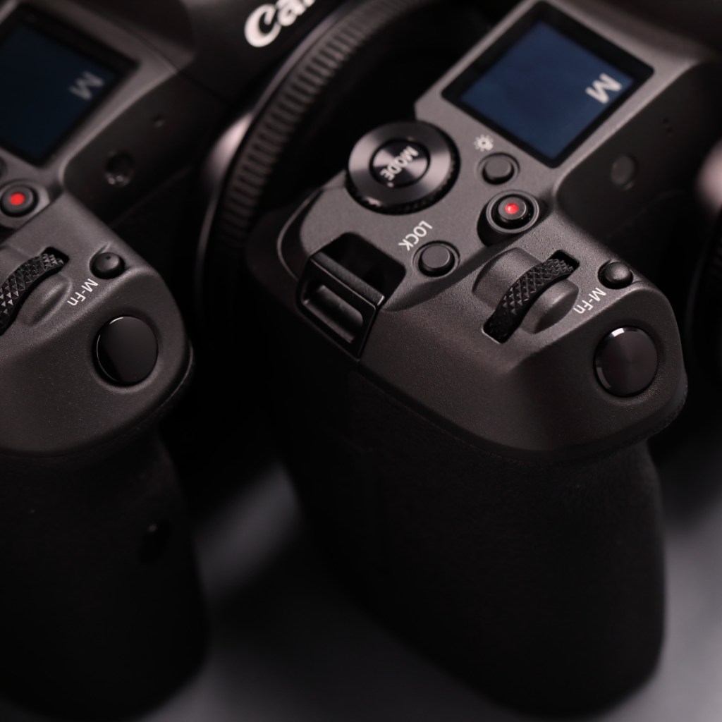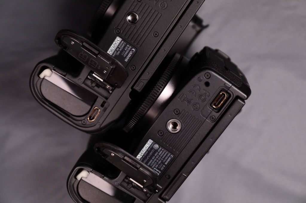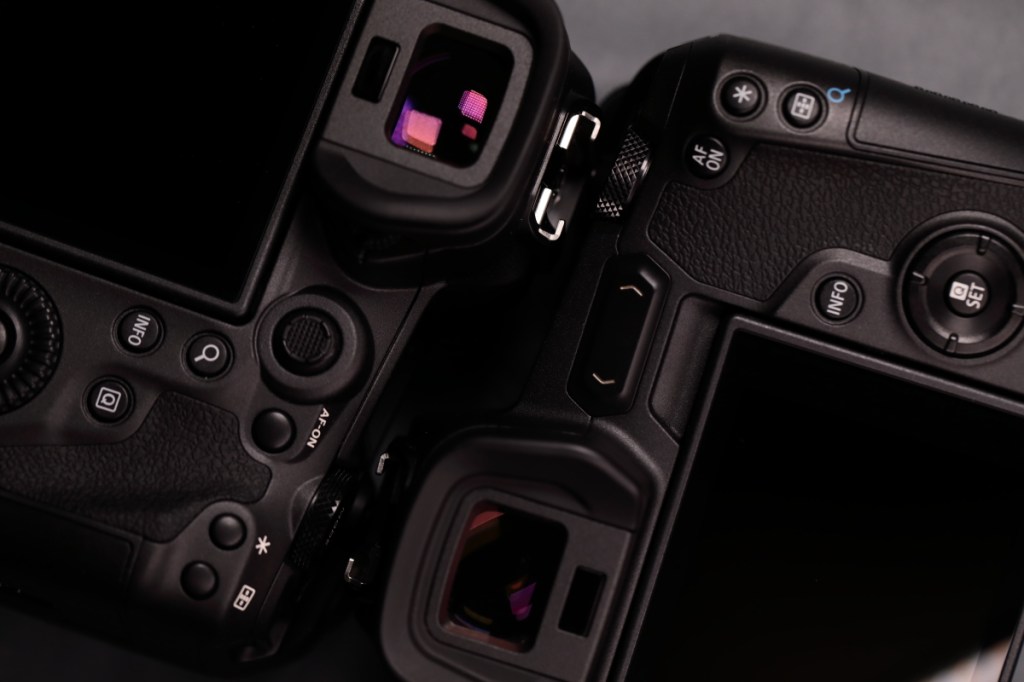 トップの写真をもう一度見てみよう、カメラの操作系が集中している右肩部分の写真だ.全体像が見えにくい、やや寄った画像だが、左右どちらがEOS R / R5かがお分かりだろうか?