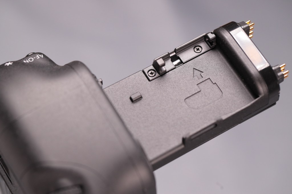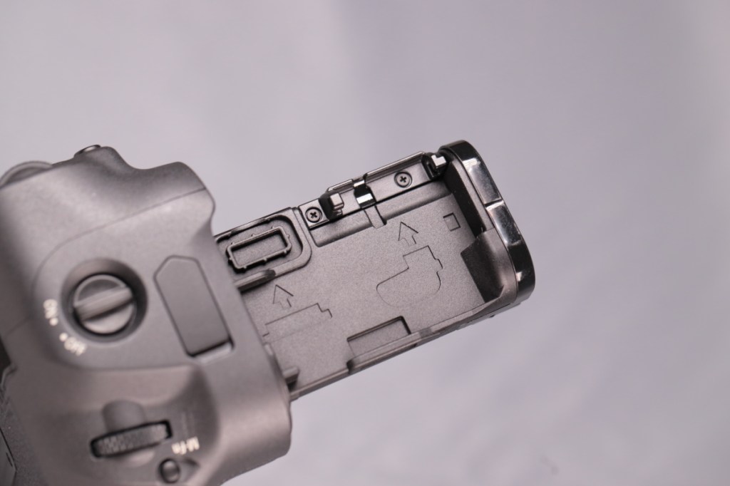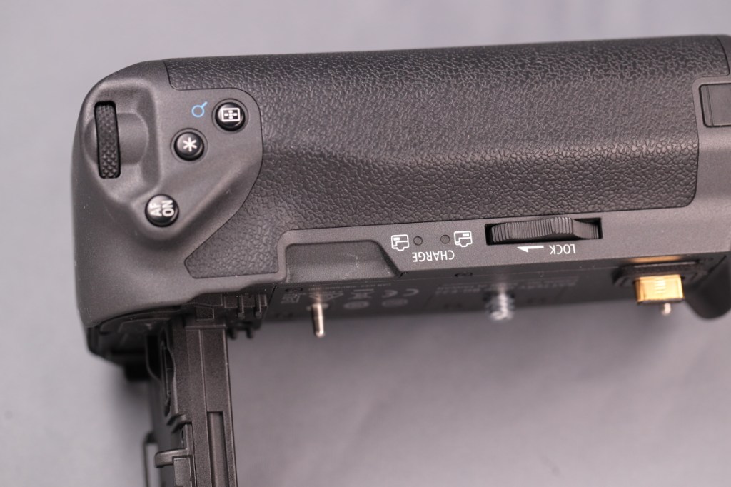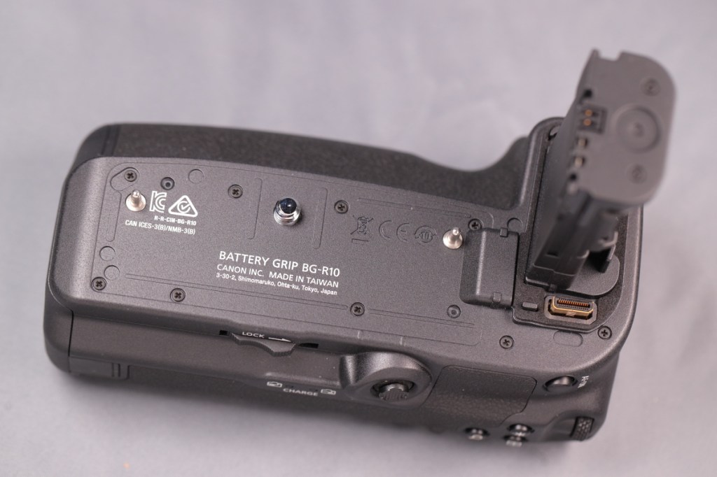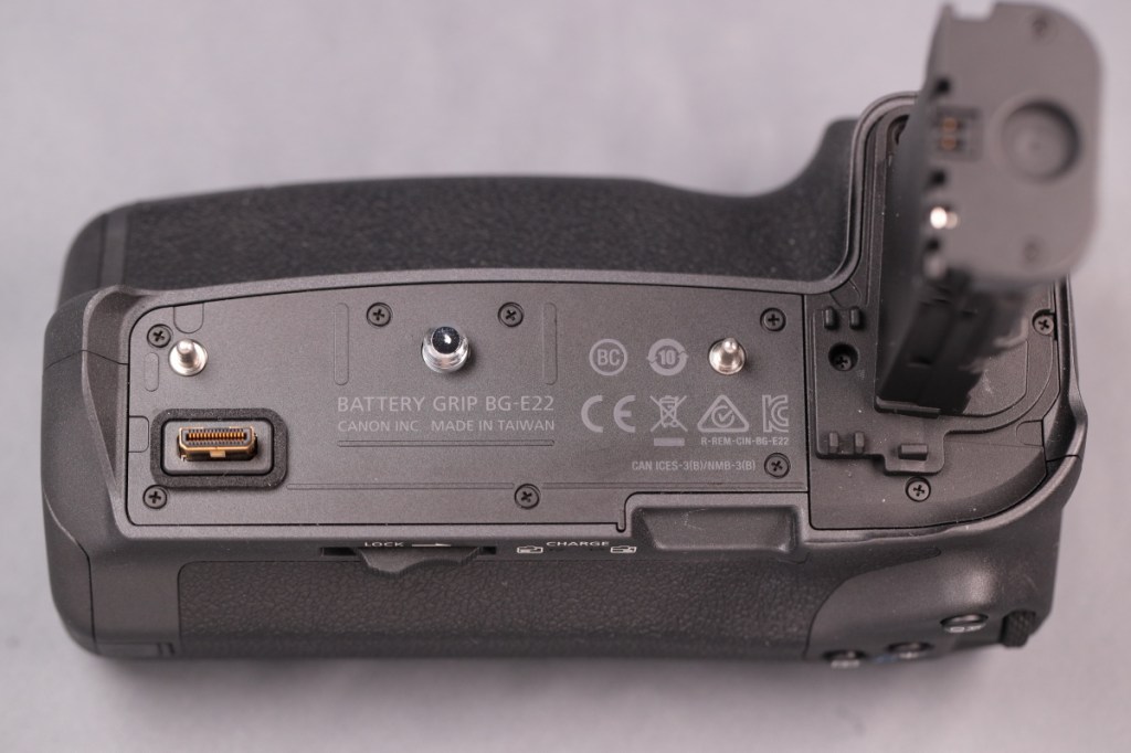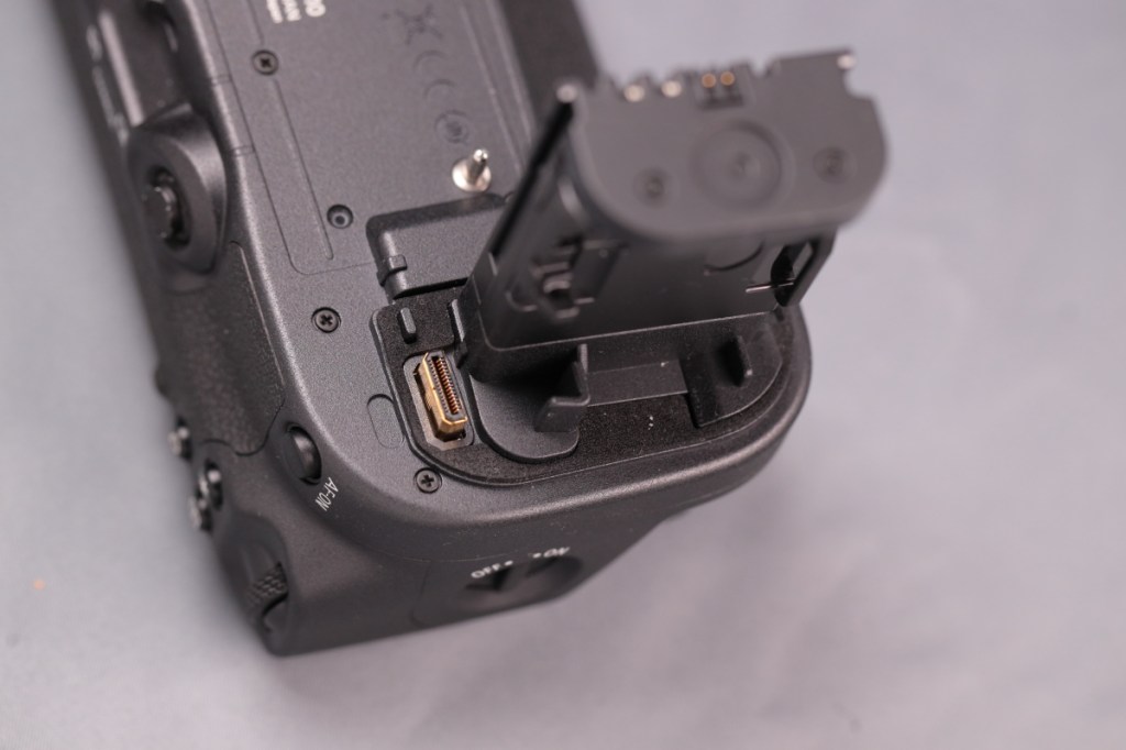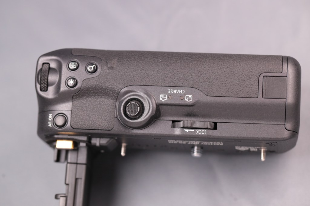 BG-E22と異なり、タワー部の根元に専用端子が移動しているため、ボディーのバッテリー蓋を外すだけで接続が可能.また、本体の仕様に合わせて、BG側にもマルチコントローラーが戻ってきた.USB-C端子はなくなったが、カメラ側の端子から充電はできるようだ.品番も新たにBG-Rxxという系列に変わった.