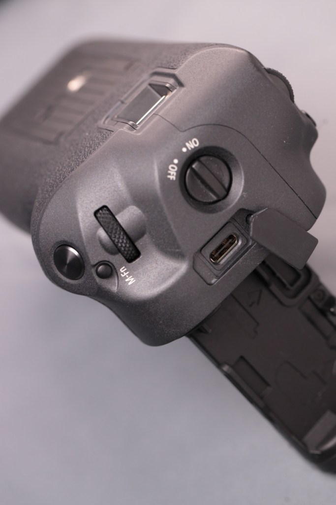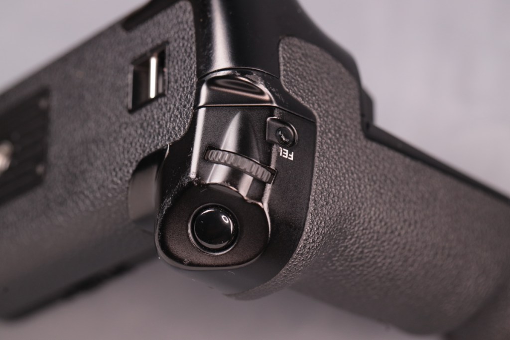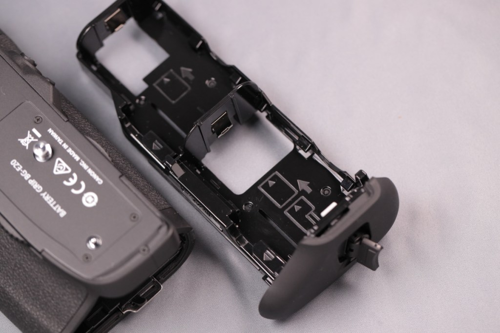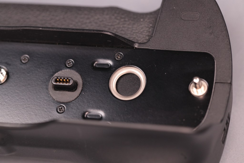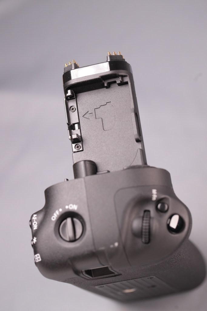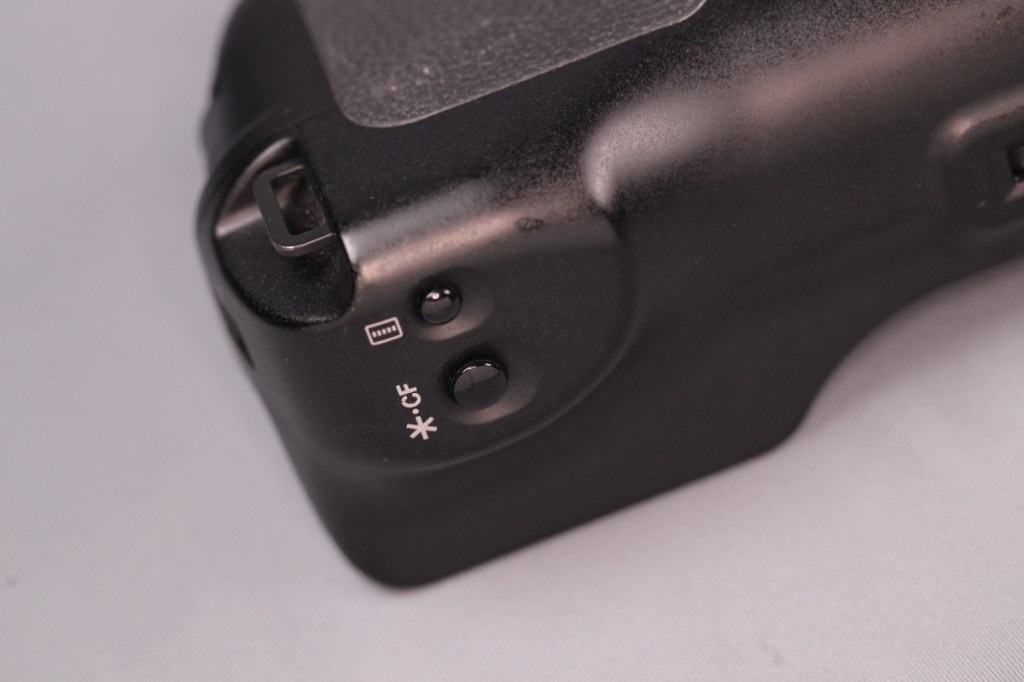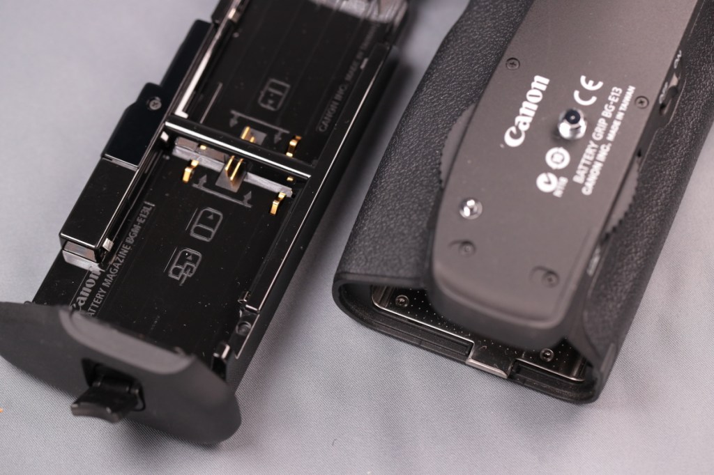 BG-E22と異なり、タワー部の根元に専用端子が移動しているため、ボディーのバッテリー蓋を外すだけで接続が可能.また、本体の仕様に合わせて、BG側にもマルチコントローラーが戻ってきた.USB-C端子はなくなったが、カメラ側の端子から充電はできるようだ.品番も新たにBG-Rxxという系列に変わった.