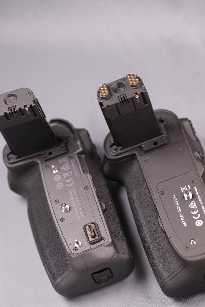 ミラーレス時代に入ってもバッテリーグリップの基本コンセプトは変わらなかったが、カメラ本体との通信が、専用コネクターによる方式に変わった.今までのバッテリーグリップはバッテリータワーの上部に接点が並んでいたが、BG-E22では、いにしえのVERTICAL GRIP VG10のように、カメラ底部のコネクターカバーを外して取り付ける形になった.このカバーもバッテリー蓋同様にタワー部右側面に取り付けられる.また、接点カバーが新コネクター用も含め白色からオレンジに変更された.このコネクターカバーの取り外し、取り付けが非常にやりにくいのが難点.BGの付け外しは歴代で最も面倒.