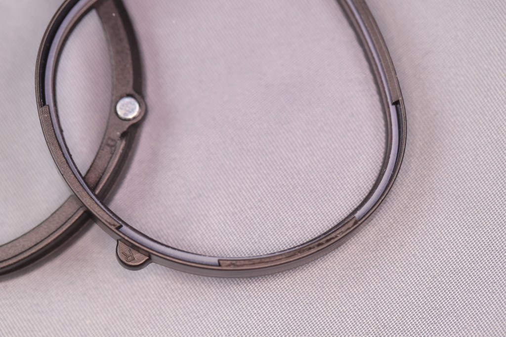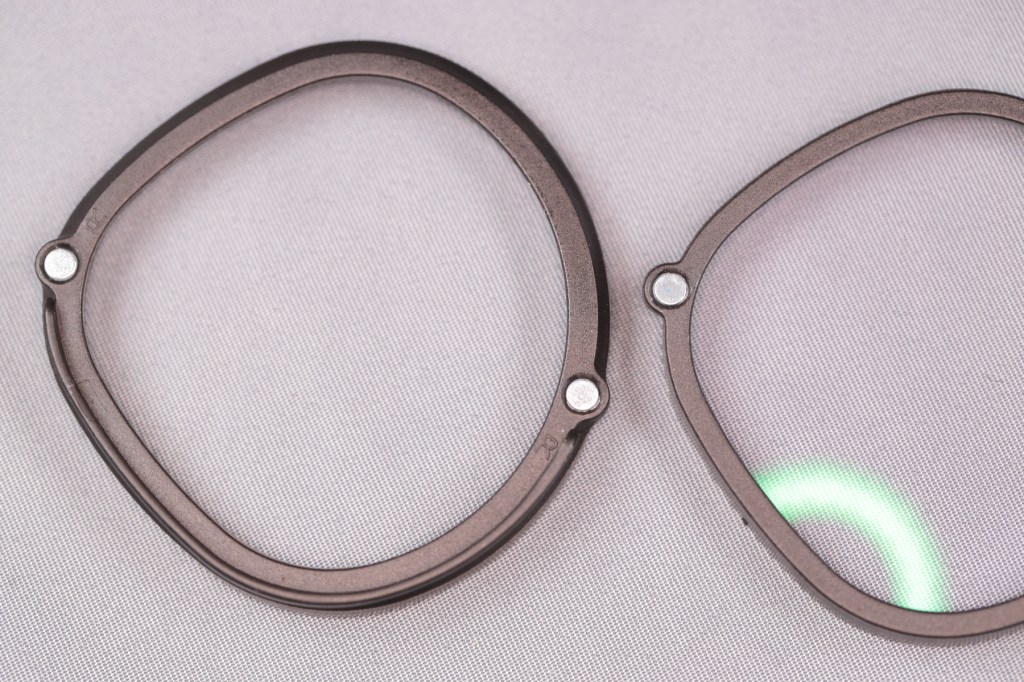 “ZBRGX Oculus Quest 2レンズスクラッチ防止リング” [Amazon]は、Oculus Quest 2の接眼レンズユニットに取り付けられるレンズホルダーアタッチメントだ.接眼部に取り付けるツメ付きのアタッチメントと、レンズを取り付けるレンズホルダーで構成されており、それぞれはマグネットで接続される.よく見るとどちらにも小さく、[R], [L]の記載があり取り付けに迷うことはない.付属しているのは、度が入っていないブルーライト防止レンズなので、別途、自分に合ったレンズを入手して入れ替える.なんとこの製品は、2セット入っている.