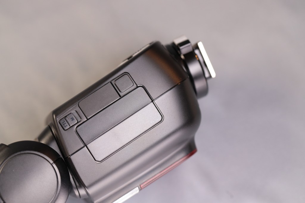 物理TCM(TTL Converted to Manual)ボタンは、位置的にあまり使いやすくない,V1と同様に4連メニューの左端がTCMに割り当てられているので、素直にそっちを使った方が良い.もしかするとProfoto A1ユーザー向けのポジションかもしれないが、少し位置が高すぎると感じる.Canon EL-1には、同様の機能としてFEメモリーがあるが、独立したSWがあるTCMの方が使いやすいかもしれない.