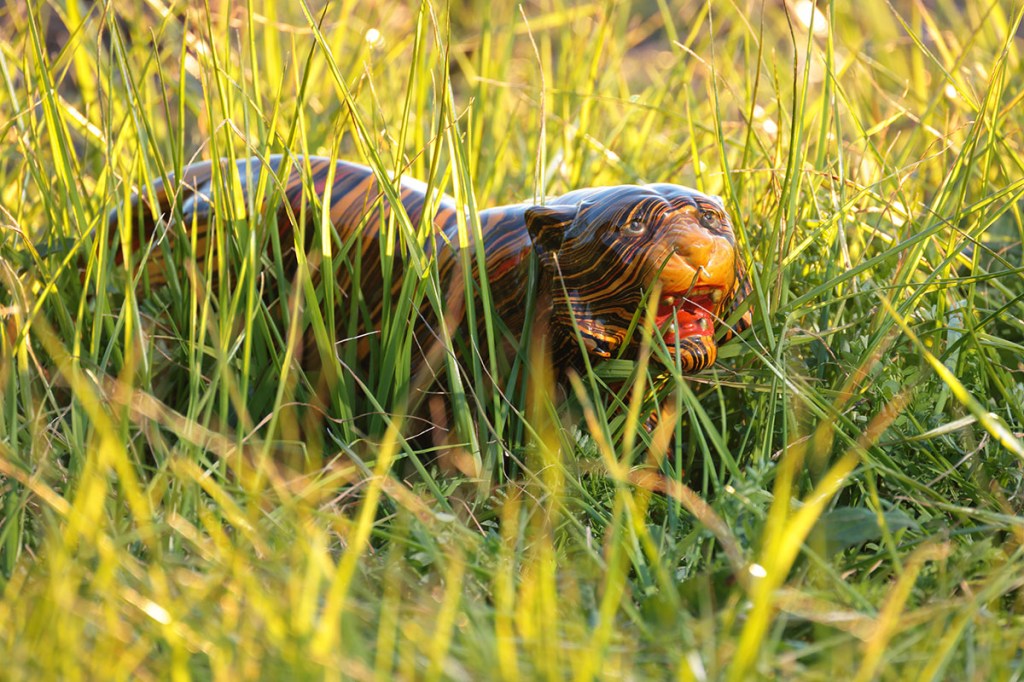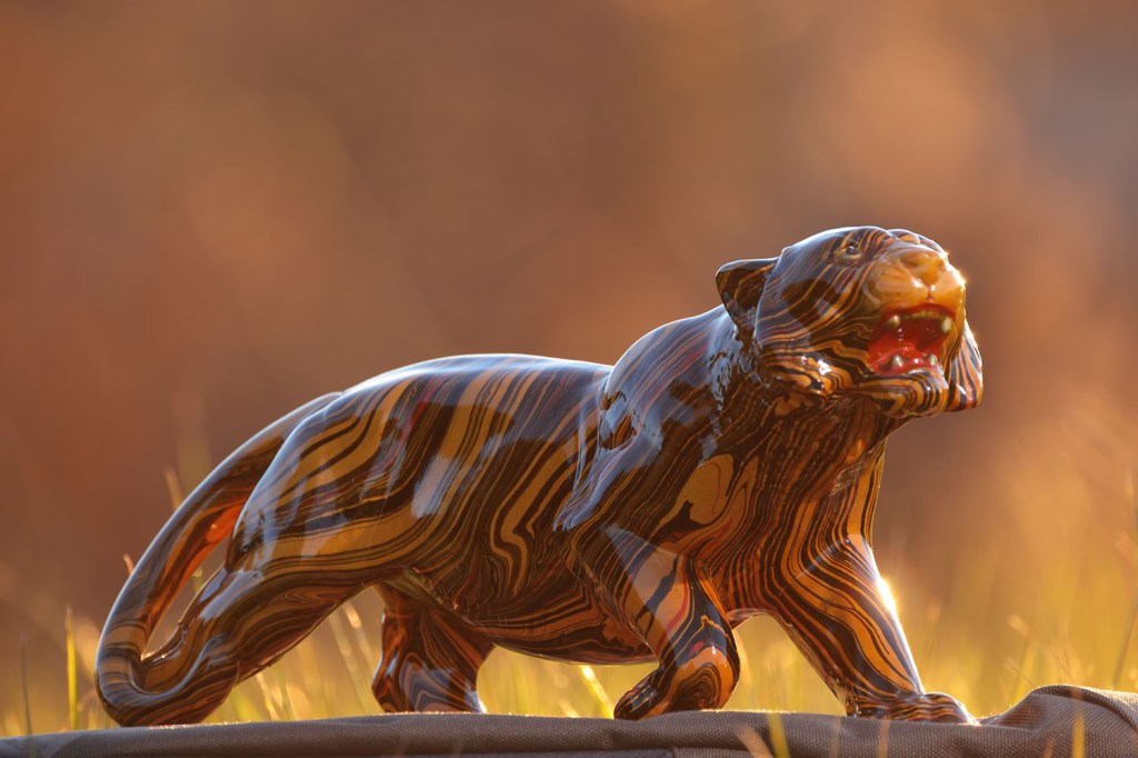 陶器の虎、全体像はこんな感じ.墨流しのような方法で着色されているらしく、柄は一般的な虎模様ではない.撮影は畑の休耕地.主が作業中だったので事情を説明して許可を頂く.撮影時間は1時間程度だが、どんどん太陽が落ちいくので使ったカットは結局、前半ラストあたりのもの.