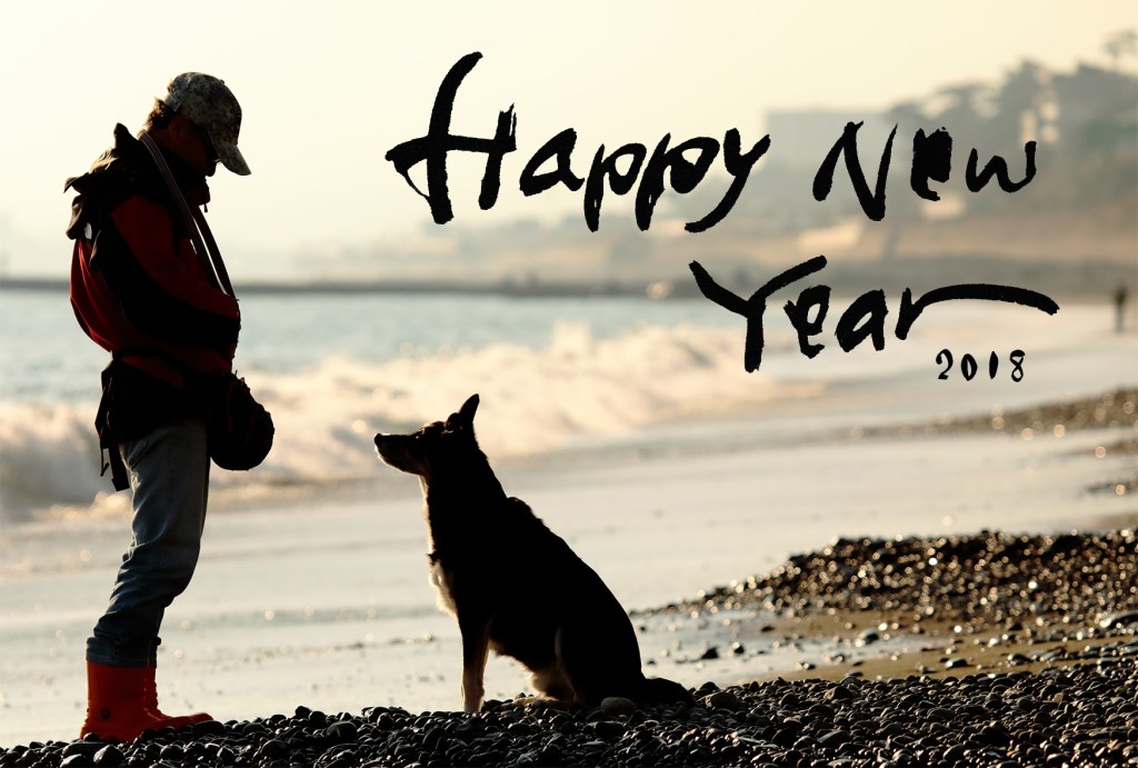 良い巡り合わせの時は、満足いく作品となる事もある.ダメな時も恥を忍んで作る.近年で思い出深いのは、2018年「戌年」の一枚.早々にイメージはできていたのだが、犬は飼っておらず、大きな犬を海岸まで連れてきてくれうる知人・友人の当てもなく、ルールを曲げて夕方3時間×3日間海岸で粘った.