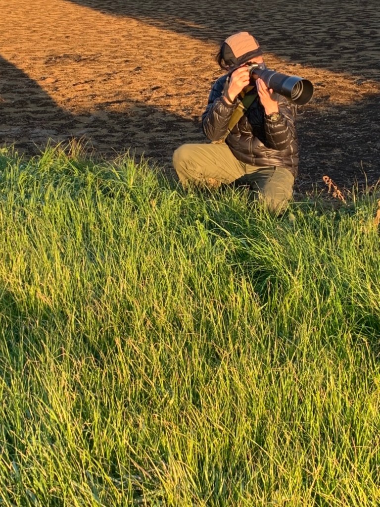 車で夕日が傾く草むらのちょっとした丘をロケハンしながら想像を働かす.ライティングは夕日の逆光で右手前からオレンジフィルターを入れたストロボ一灯.テスト撮影から、かなり望遠寄りの方がスケール感が出そうということが分かったのでレンズは手持ちで最も長い800mmをチョイス.被写体距離は約10mm、幸い1m弱の段差があったため、地面に寝そべる必要は無かった.