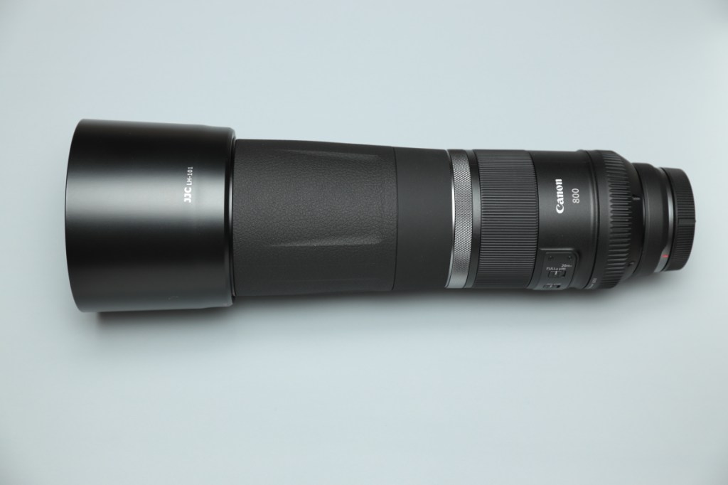 RF 800mm F11 IS STMは、まさに従来では考えられなかったスペックのレンズで、私も楽しみながら使っている.JJC ET-101は、型番の通りRF800mm F11用の互換フードだ.取り付けや使用感には問題が無いが、唯一、この互換フードは逆付けしたときに問題がある.というか、きちんと逆付けできない.このストッパ付きのフード取り付け部は、以外と細かいミゾが組み合わさっており、この互換フードはミゾの加工精度が少々悪いようだ.ただし、このJJC ET-101は、一応、反射防止用の塗装がなされていおり、先のJJC EW-65Cなどより内面反射はおさえられている.もっとも純正のET-101は溝加工が付加されているので有意差があるかもしれない.