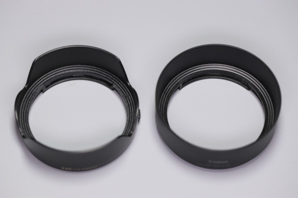 先日、入手したRF16mm F2.8 STM [Canon / kitamura ]のフードは例によって入手困難だったが、ビックリすることにレンズ発売当初から互換フードが売られていた.RF16mm用の純正フードは入手困難なので、写真では、所有している焦点距離以外はほぼ同等と思われるRF50mm用の純正フードと比較している.