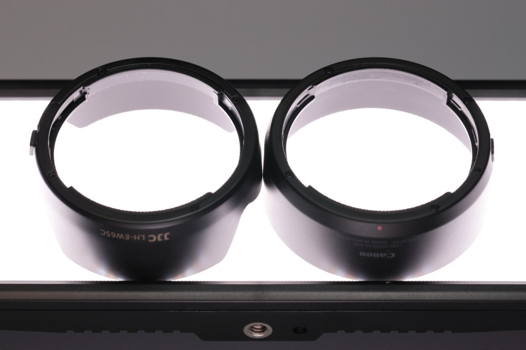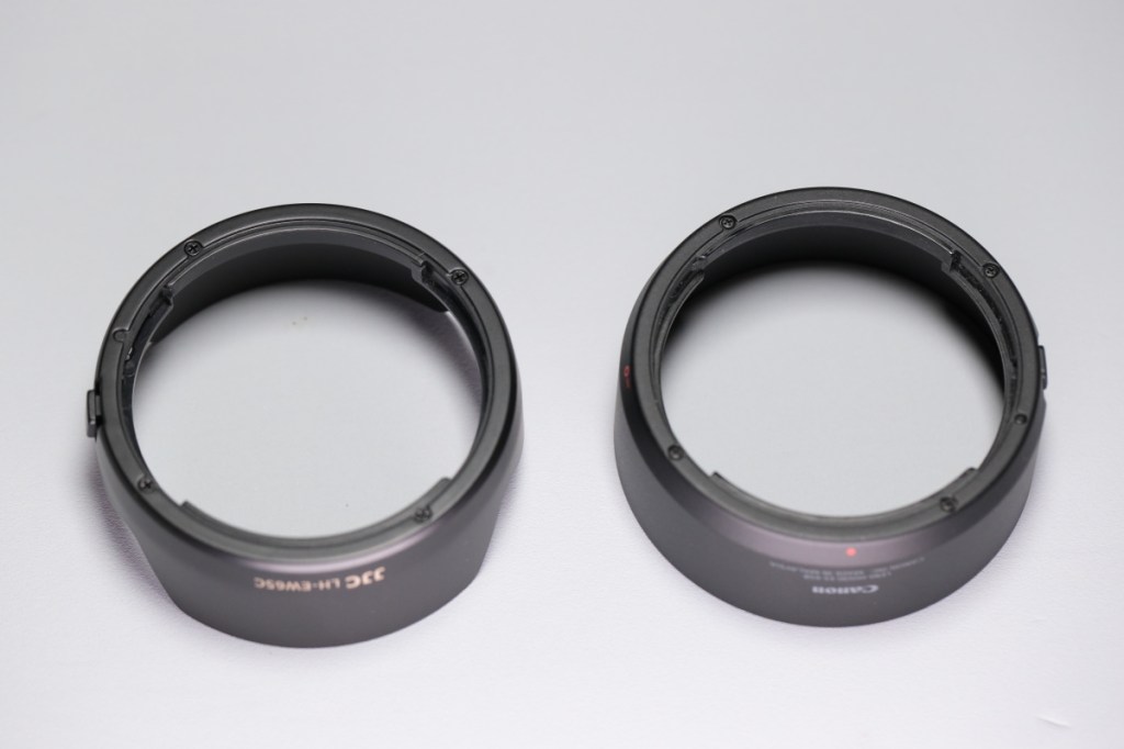 RF50mm F1.8 STMと、RF16mm F2.8 STMは外観がほぼ同じで、フード取り付け部の形状も同一だ.これら二つのレンズフードはどちらのレンズにも取り付けることができる.このあたりが、RF16mm用互換レンズフードの共有が早かった事情なのかもしれない.