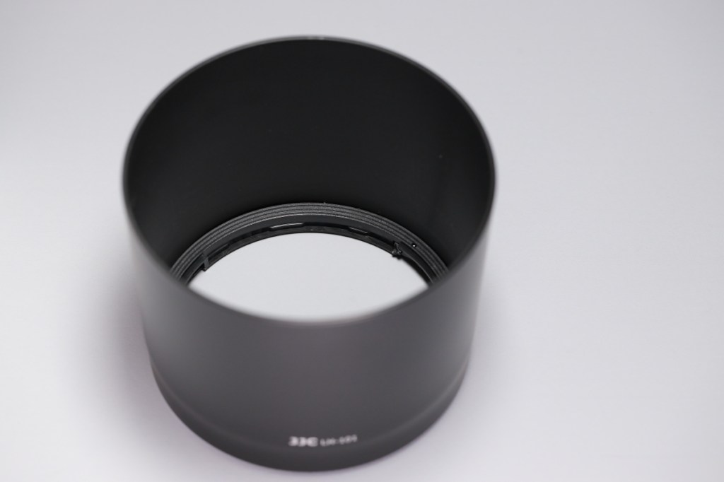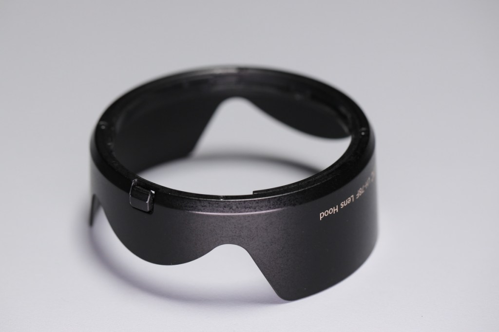 そして、”手間”で問題なのは、フードもやはり手に入らない.RF50mm F1.8 STMの時には、レンズは発売日に手に入れたがフードは2ヶ月待つことになった.その間は、フィルタースクリューにねじ込むタイプのフードを付けていたが、アレはAF周りに負担をかけるので可能な限り使いたくない.そこで、どうせ代替品を使うならば、レンズ筐体側に取り付ける純正互換のフードを使う方が良い.