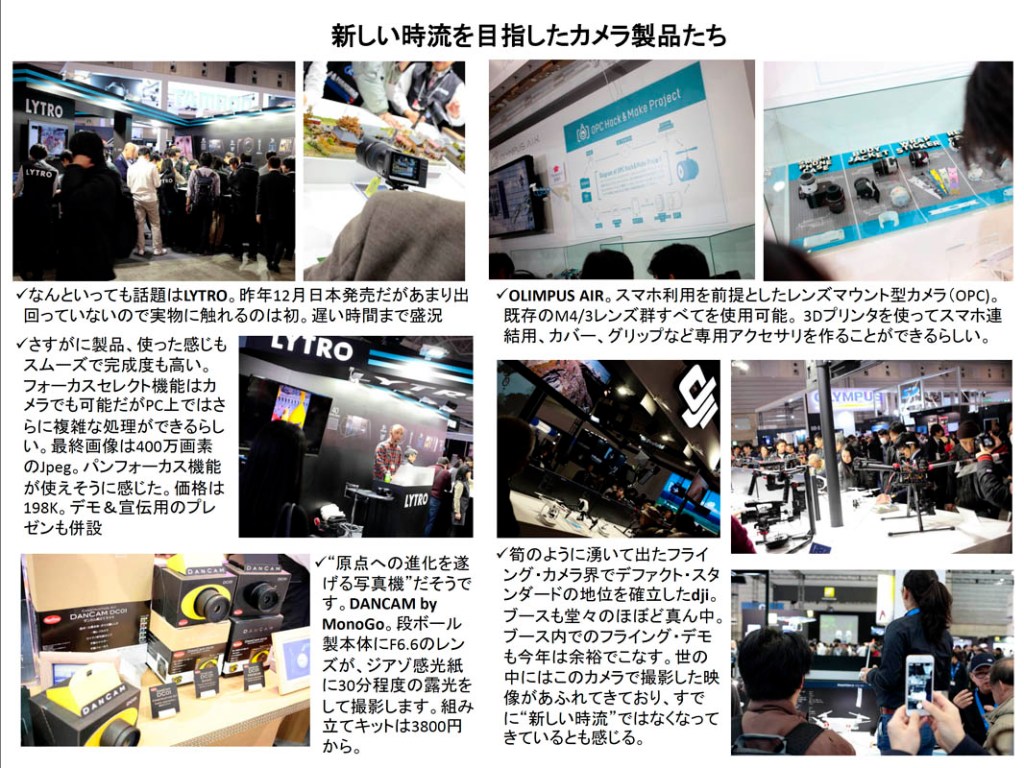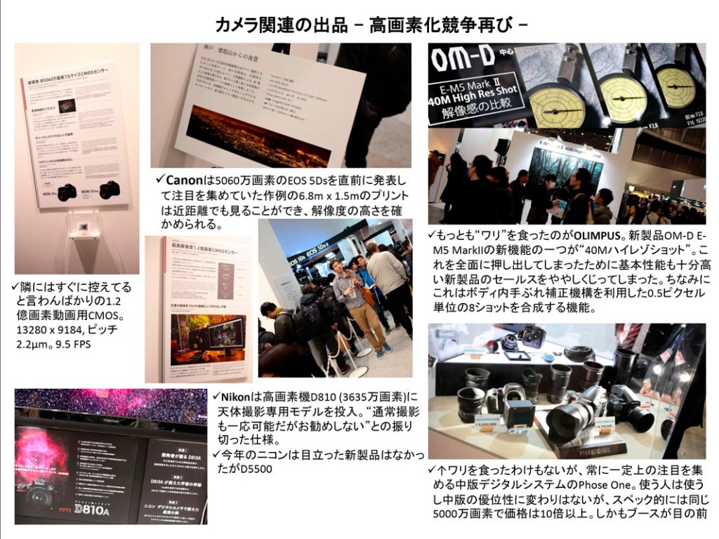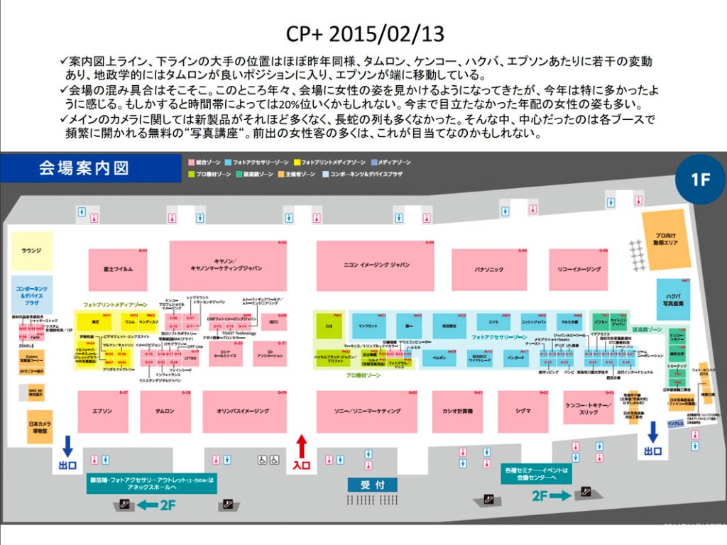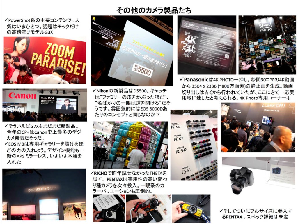 少し懐かしさで、PCのフォルダーをさかのぼってみた.何のためだかは忘れてしまったが、2015年前後は、CP+の簡単なまとめレポートを作っていたようだ.古い過去のドキュメントを時間がたってから公開するのは恥ずかしい気持ちになるのだが、せっかくなので見つけたので当時の内容そのままに、画像として一部を公開する.内容に不備があったりするかもしれないが、ご容赦願えれば幸いである.