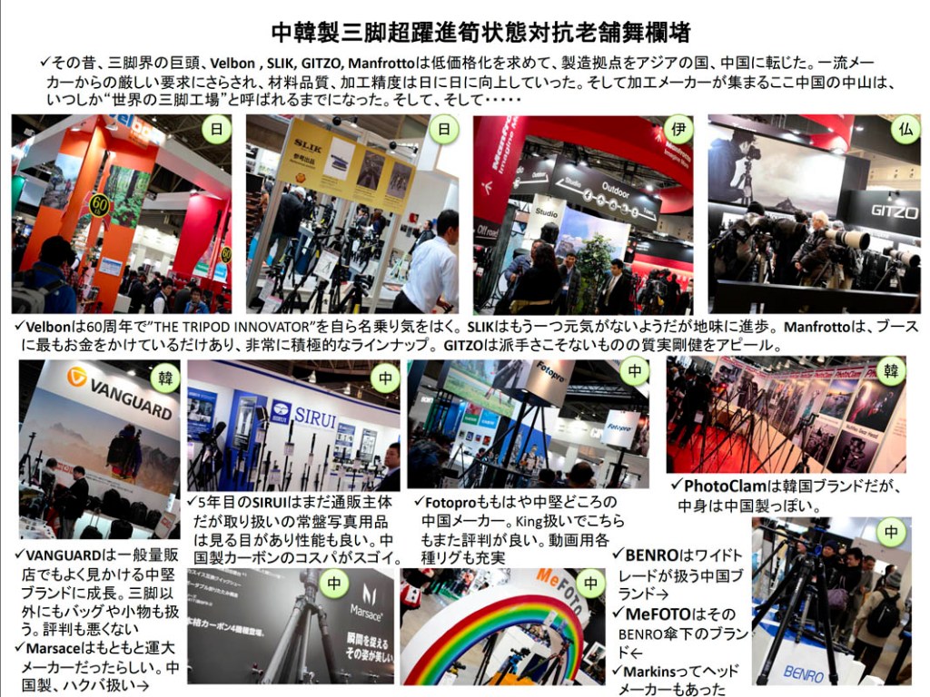 CP+2015は、2013年に発表されたSONY Eマウントカメラが少しずつ目立つようになってきた時期である.まだまだ、市場ではデジタル一眼レフが主流であり、次世代(ミラーレス)はまだもう少し先だと誰もが考えていた.一方で、この時代からCP+の会場の女性比率が少しずつ増えてきたと感じていたようだ.そして一時期、収束していたと思われていた撮像センサーの高画素化競争が、再び激しくなってくる予兆があった.個人的に気になったのは、中国製三脚の躍進であった.出展者と話をしたところ、中国の中山では世界の三脚工場と呼ばれており、世界中の三脚を作っているそうだ.そして、そこから新しい三脚メーカーが生まれているという.