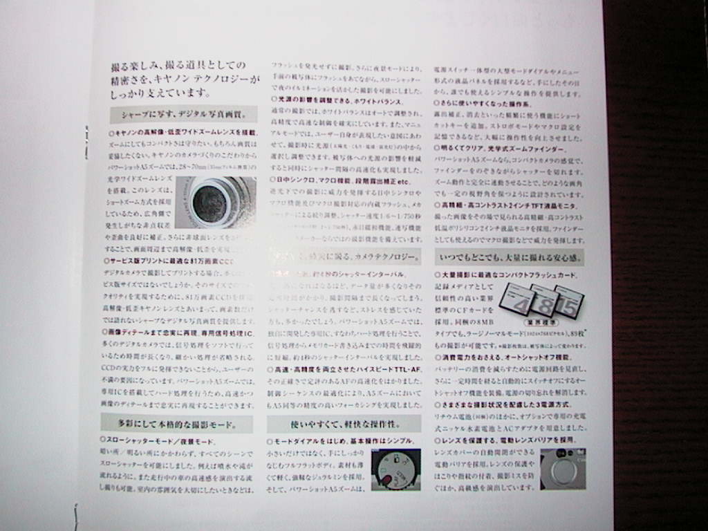今なら、スマートフォンのカメラで何でもメモ的に撮影を行っている人は多いことだろう.つまりはそういうことだ.PowerShot A5 Zoomは、総画素数81万画素、記録画素数1024 x 764で、細かい文字などは読み取ることができない場合もあったし、バッテリーの持ちも良くなかった.写真機としては、当時、画質が良くないこと言われたAPSフィルムカメラにすら到底かなわなかった.