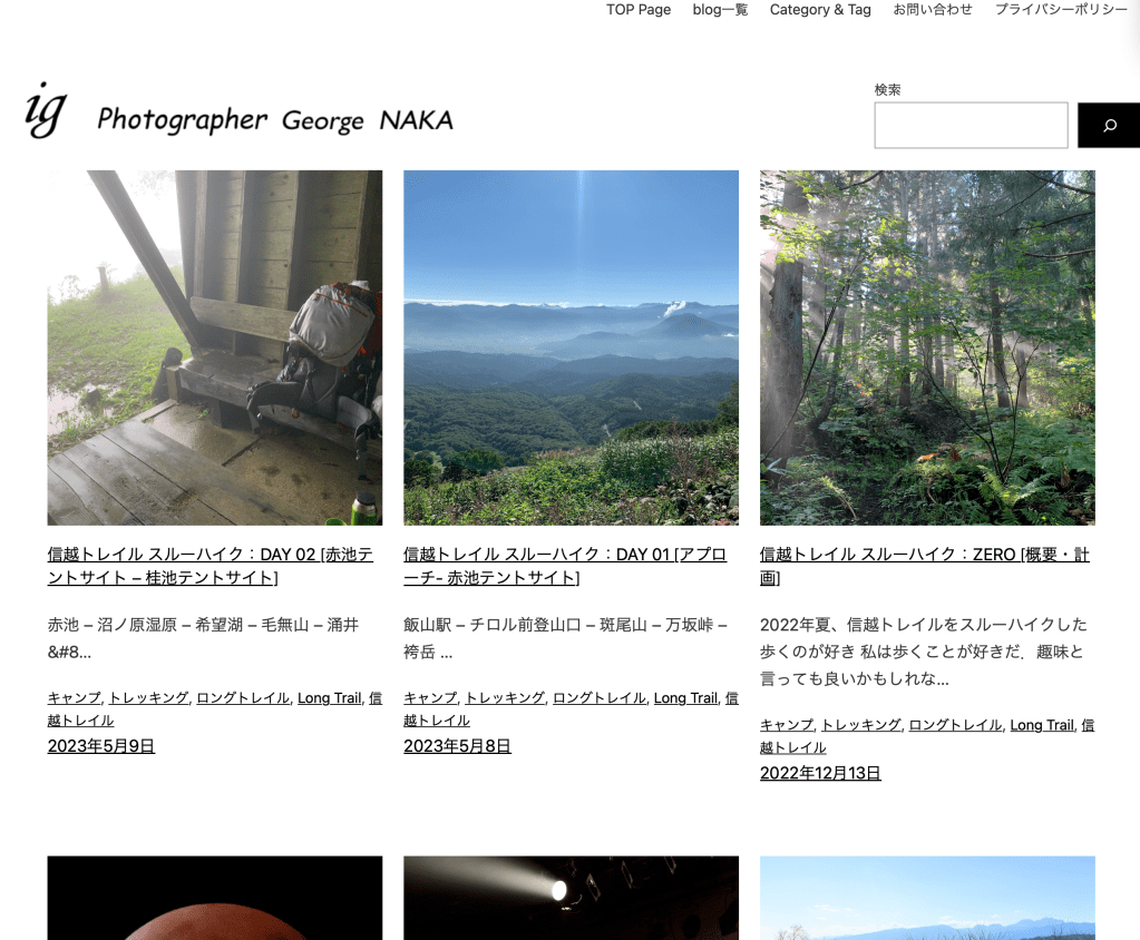 テンプレートに全面的に手を入れて、固定ページも刷新した.特に、インデックテンプレートを充実させ、blog一覧、検索結果、タグ・カテゴリーごとの一覧表示を見やすくした.最近、Oudoorカテゴリの投稿が増えてきたのにカテゴリごとの一覧表示ができなかったところを改善.
