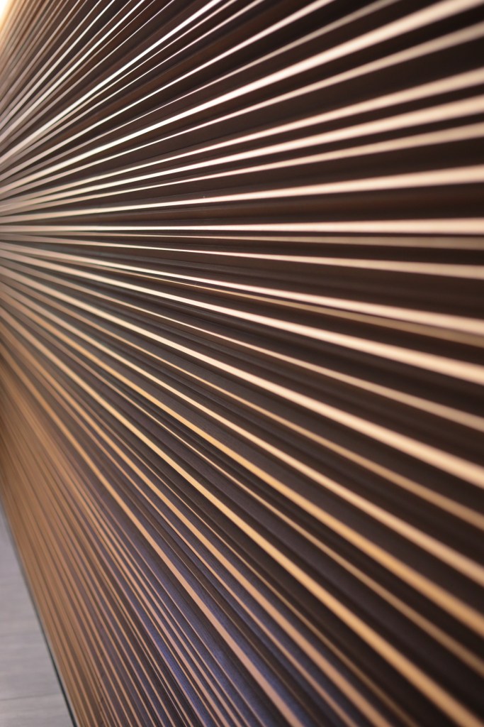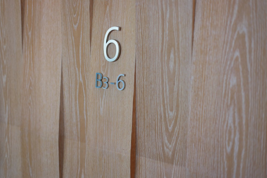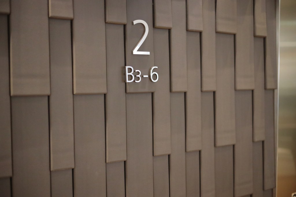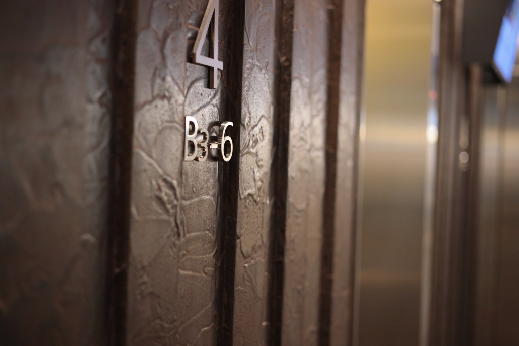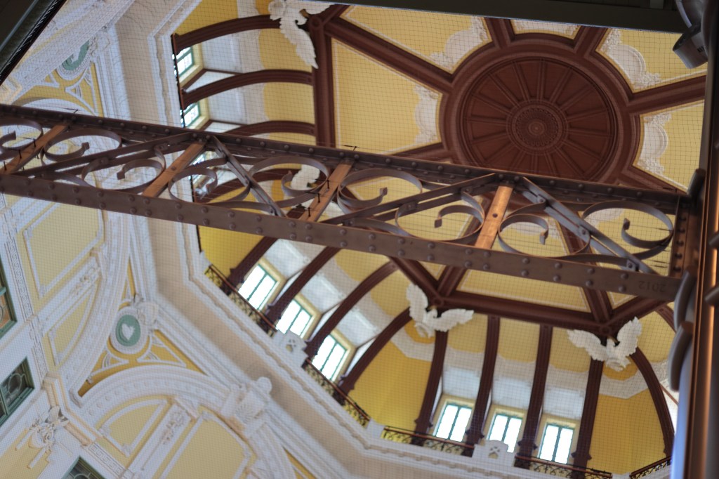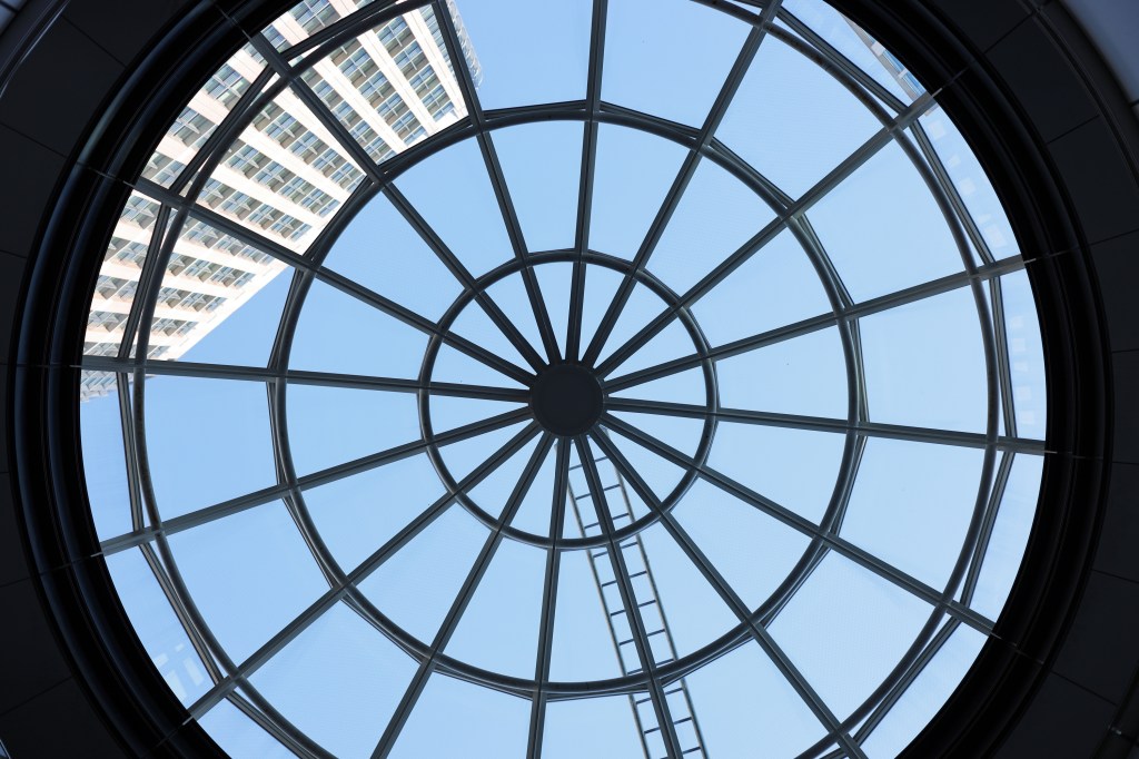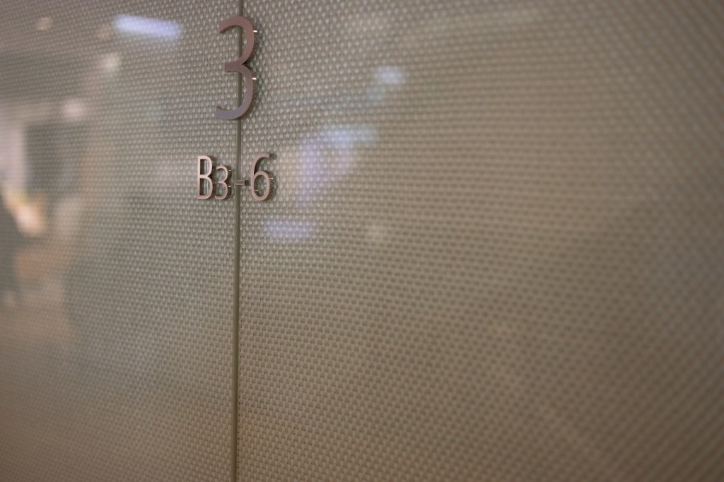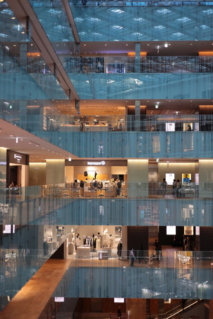 駅の左手、南側に「KITTE丸の内」が見える、東京駅を見下ろせる位置にある6階建てのビルで、だれでも屋上に上ることができる.建物に入ると中央が吹き抜けになっており、天井の硝子窓から外光が差し込む.各階のエレベーターホールは、その階毎に異なるデザインとなっている.こういうのを見ると撮りたくなる.