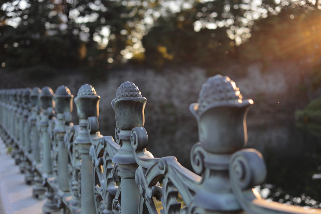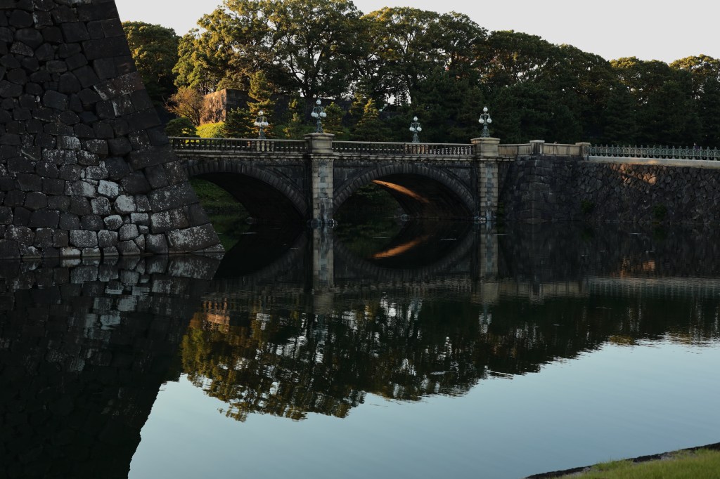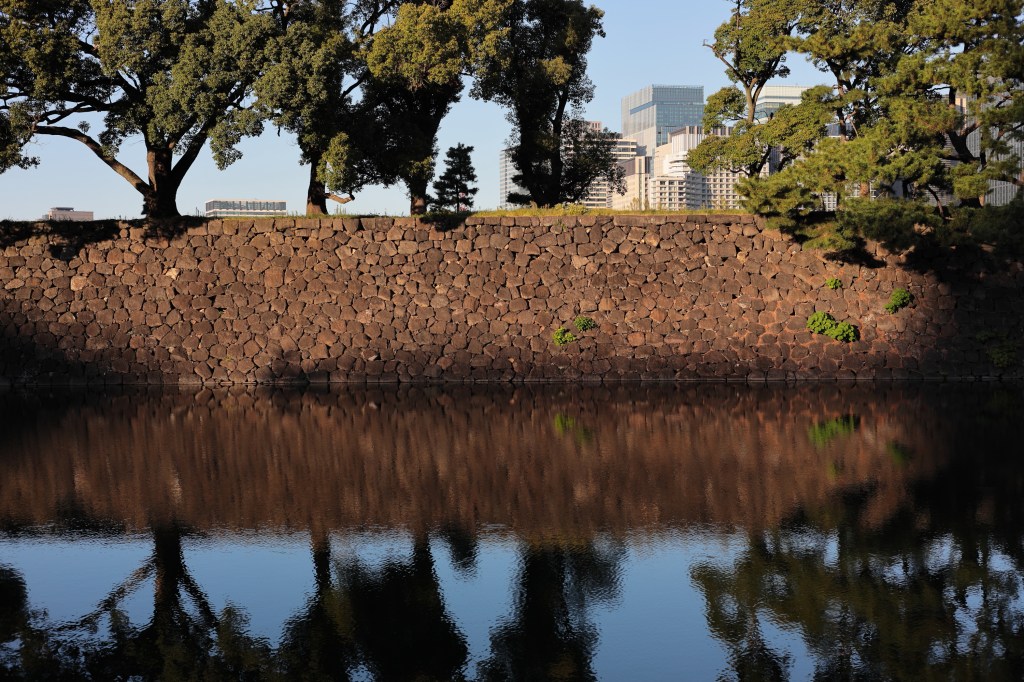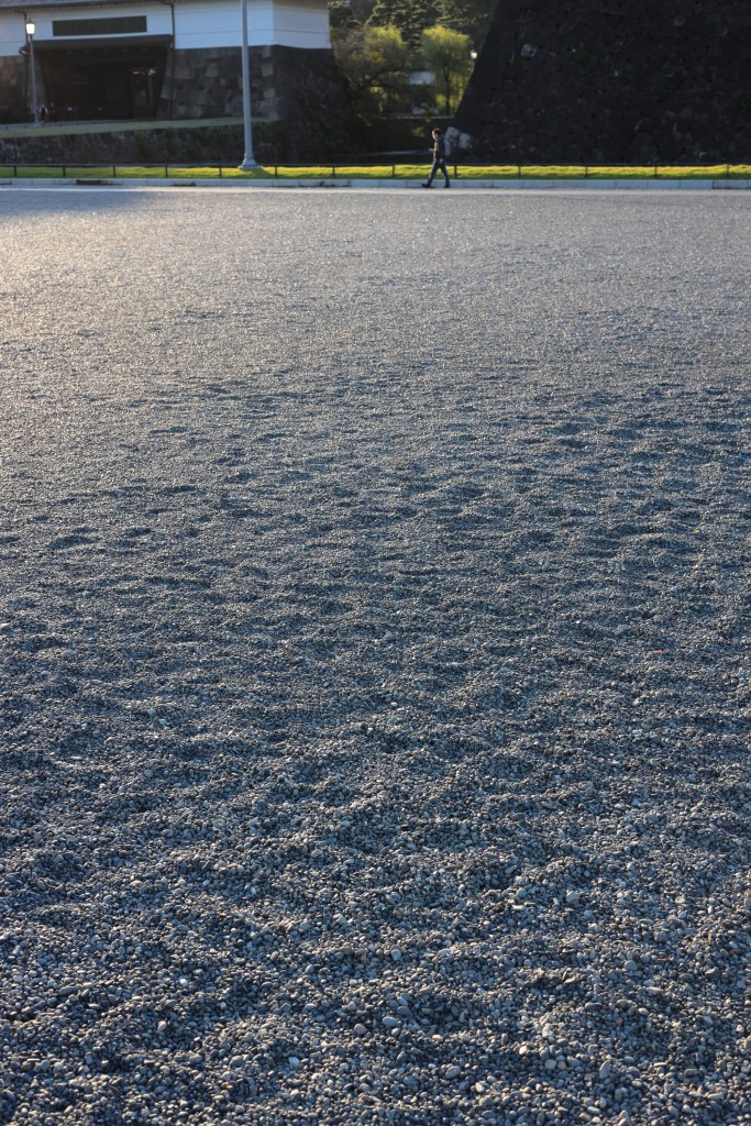 かなり陽は傾いてきた.こうなると面白い影を探したくなる.広場に敷き詰められた砂利には、ここを訪れた多くの人の足跡が残されていた.正門石橋(眼鏡橋)の裏側にわずかに残る日差しに目がとまる.振り返ると、皇居の森の影がオフィス街のビルに迫っていく.